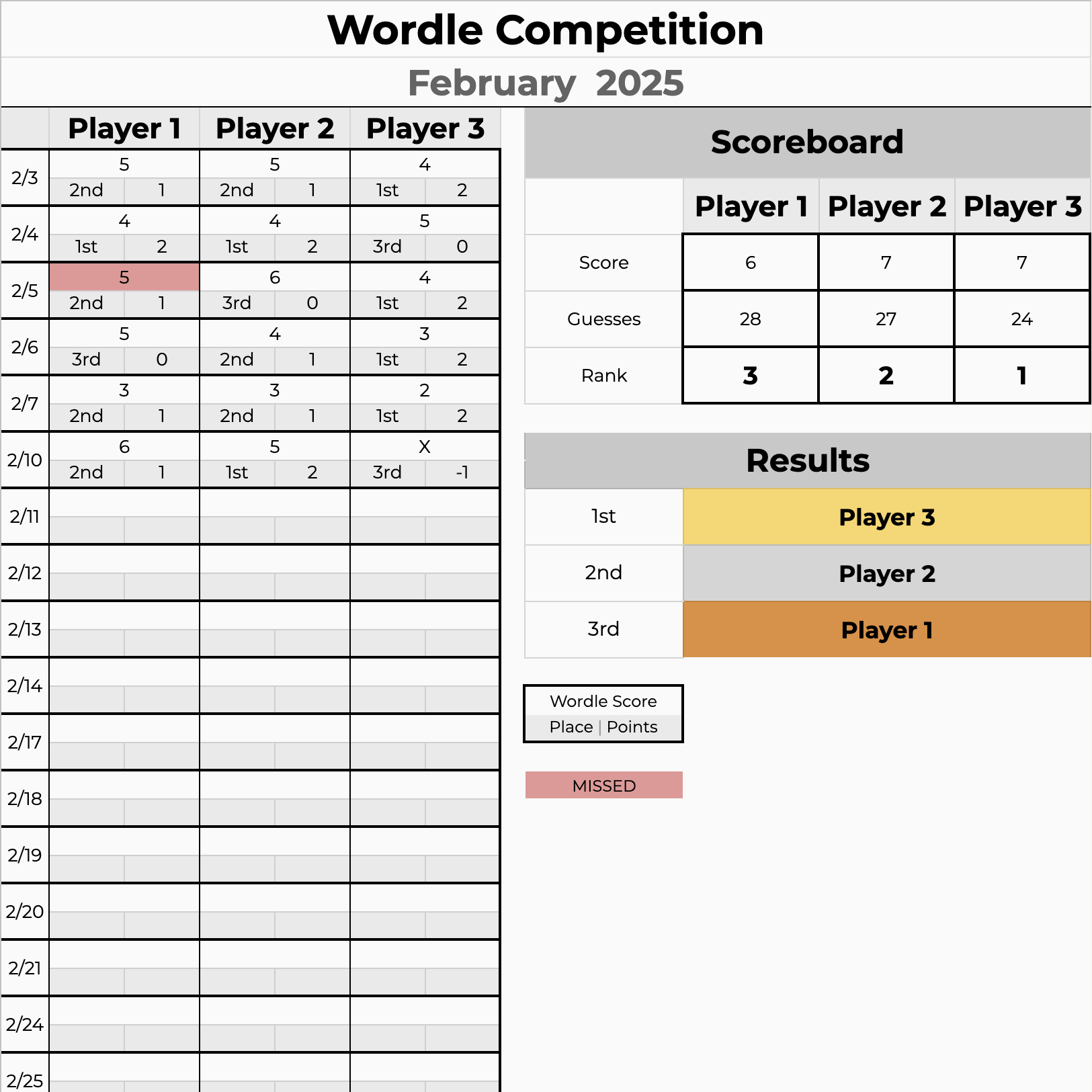 An automated scoreboard to track and rank Wordle scores. Participants email their scores to a parser, and the spreadsheet does the rest.